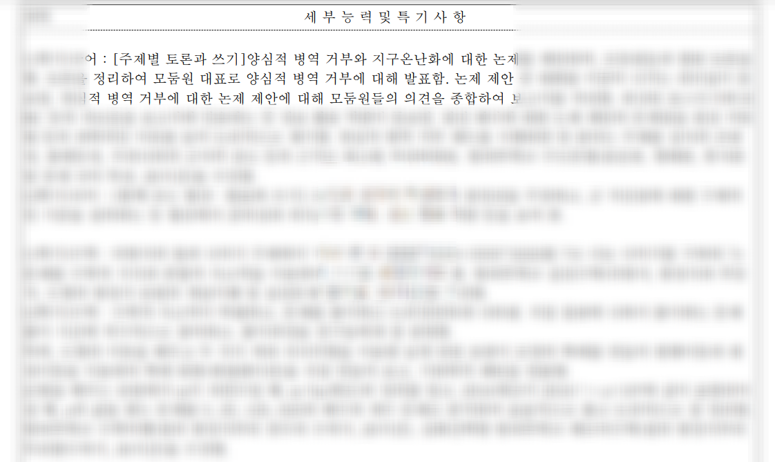 이처럼 수행평가 를 잘 수행 한 기록만이 아니라 수행평가 이후에 제가 어떤 것을 느꼈는지, 또 그 이후에 어떤 부가적인 활동을 했는지 작성함으로 성실성과 열정을 강조할 수 있습니다.