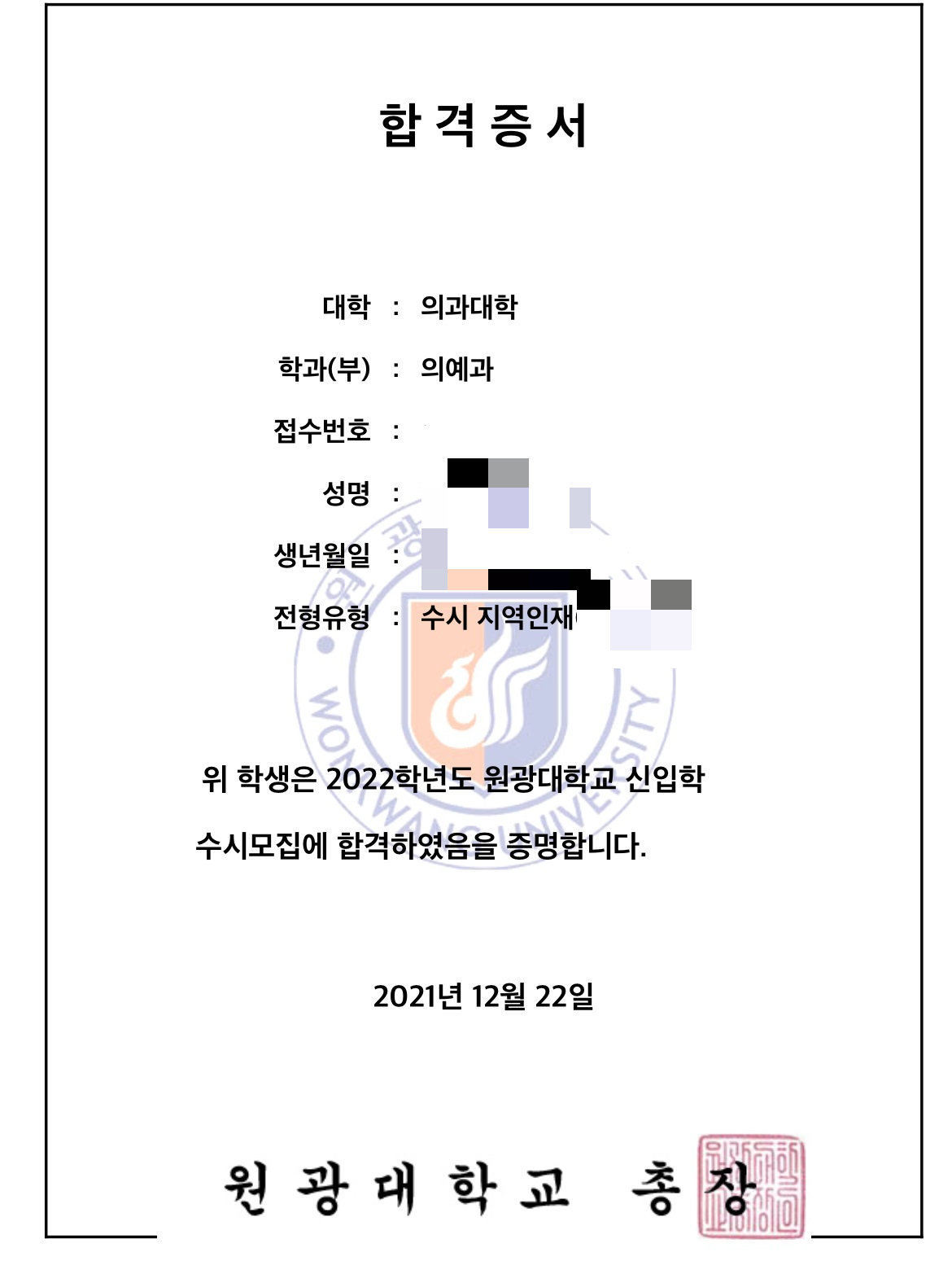 2022학년도 원광대학교 의예과에 학생부 종합 지역인재전형으로 합격한 이ㅇㅇ 입니다.