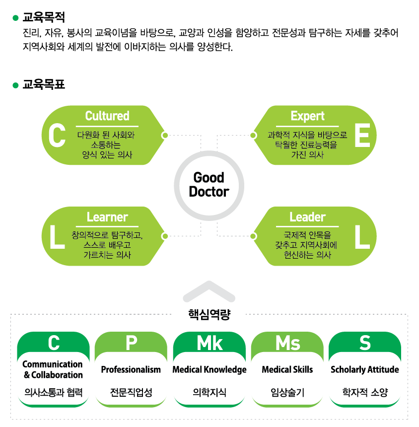 교양과 인상을 함양하고 전문성과 탐구하는 자세를 갖추어 지역사회와 세계의 발전에 이바지하는 의사를 양성하는 것을 목적으로 합니다.