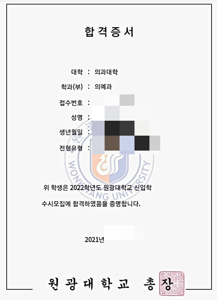 2022학년도 원광대학교 의과대학에 수시 학생부 종합전형으로 합격했습니다.