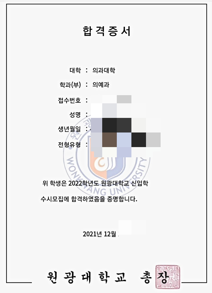 원광대학교 의예과에 2022년 학생부 종합전형으로 합격하였습니다.