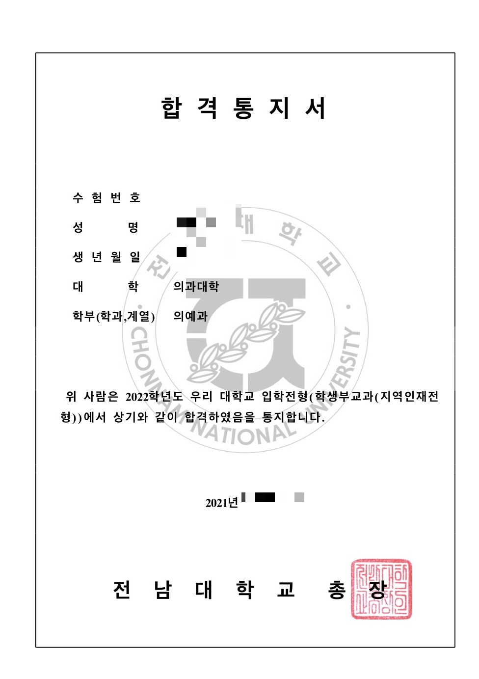 2022학년도 전남대학교 의예과 에 학생부 교과전형 지역인재전형으로 합격했으며,